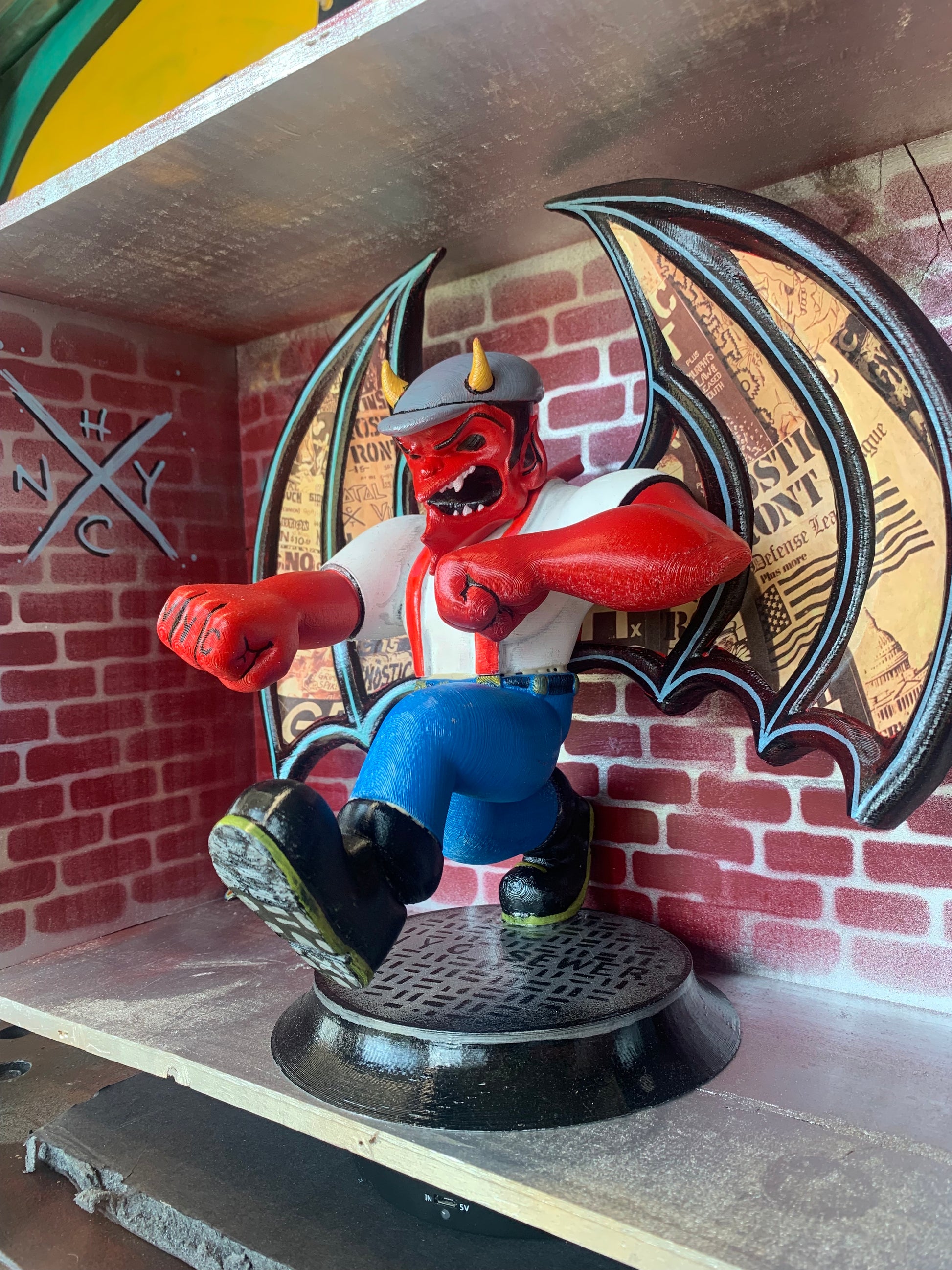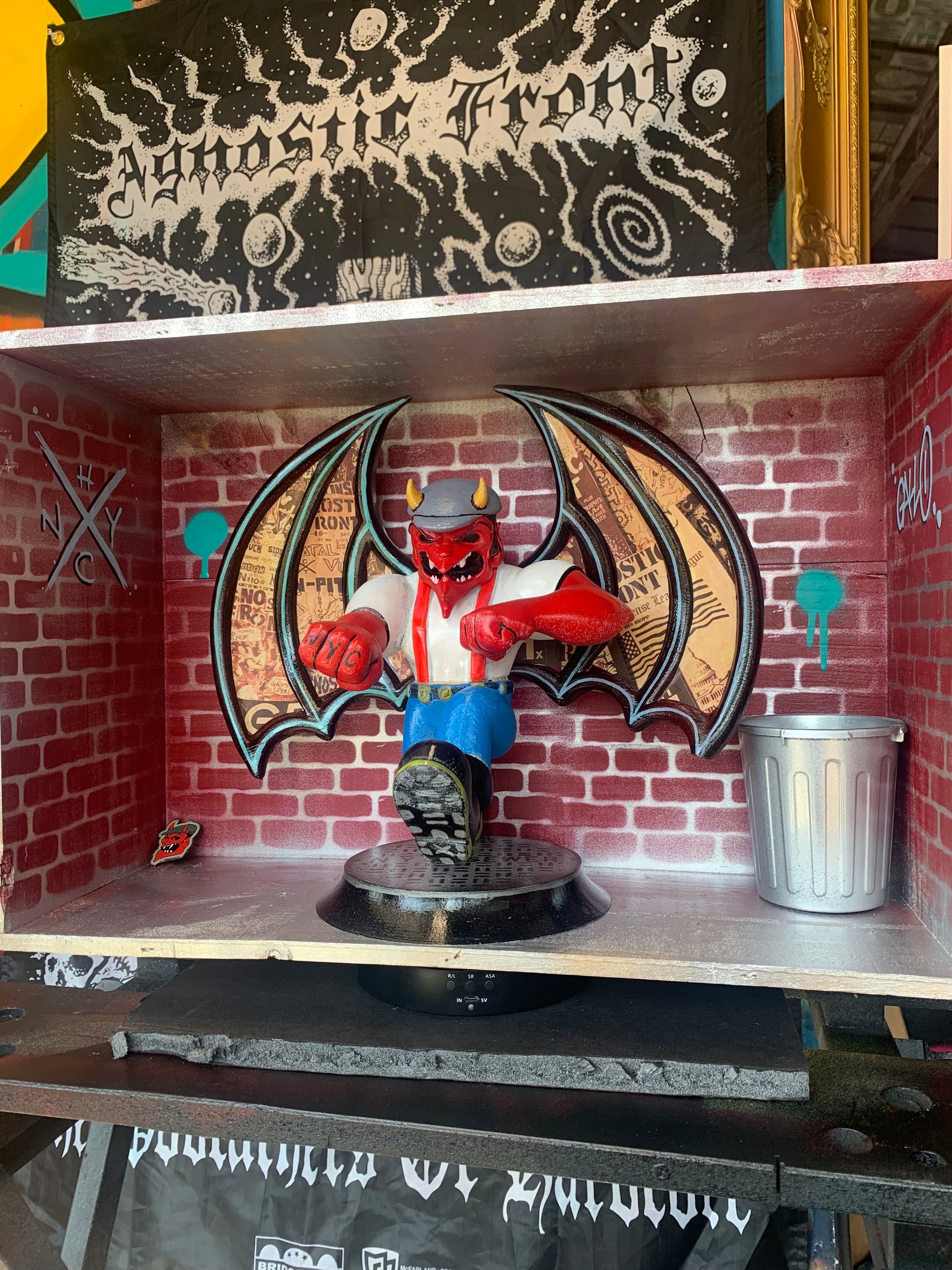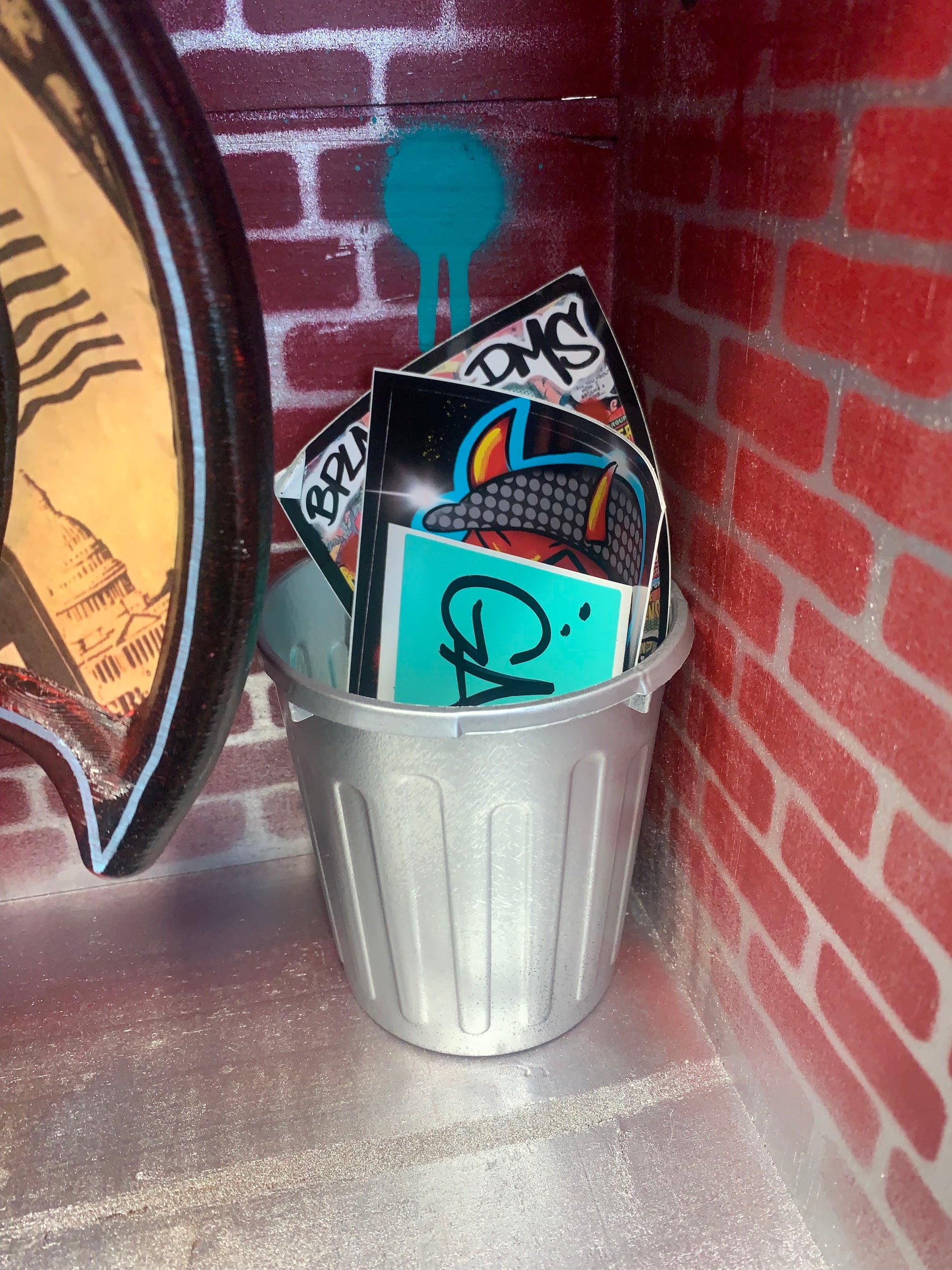 He’s 12 inches high and wide. 3D printed. Old school band flyers in his wings. Louie comes in a hand painted wine box, equipt with garbage can filled with stickers and a collectors enamel pin. This is not something that will be mass produced by a toy company. DIY style. GET IT NOW!