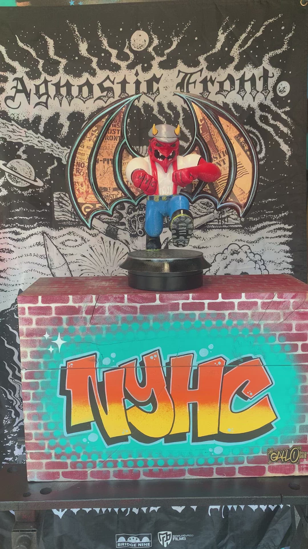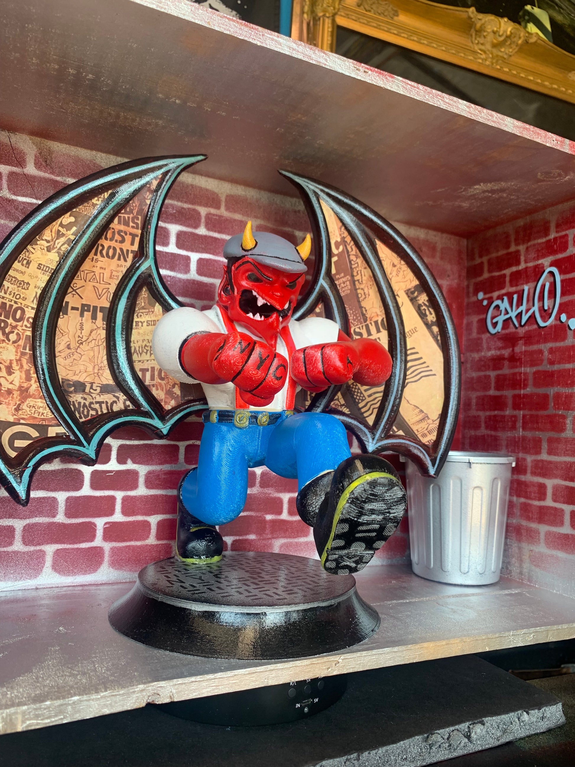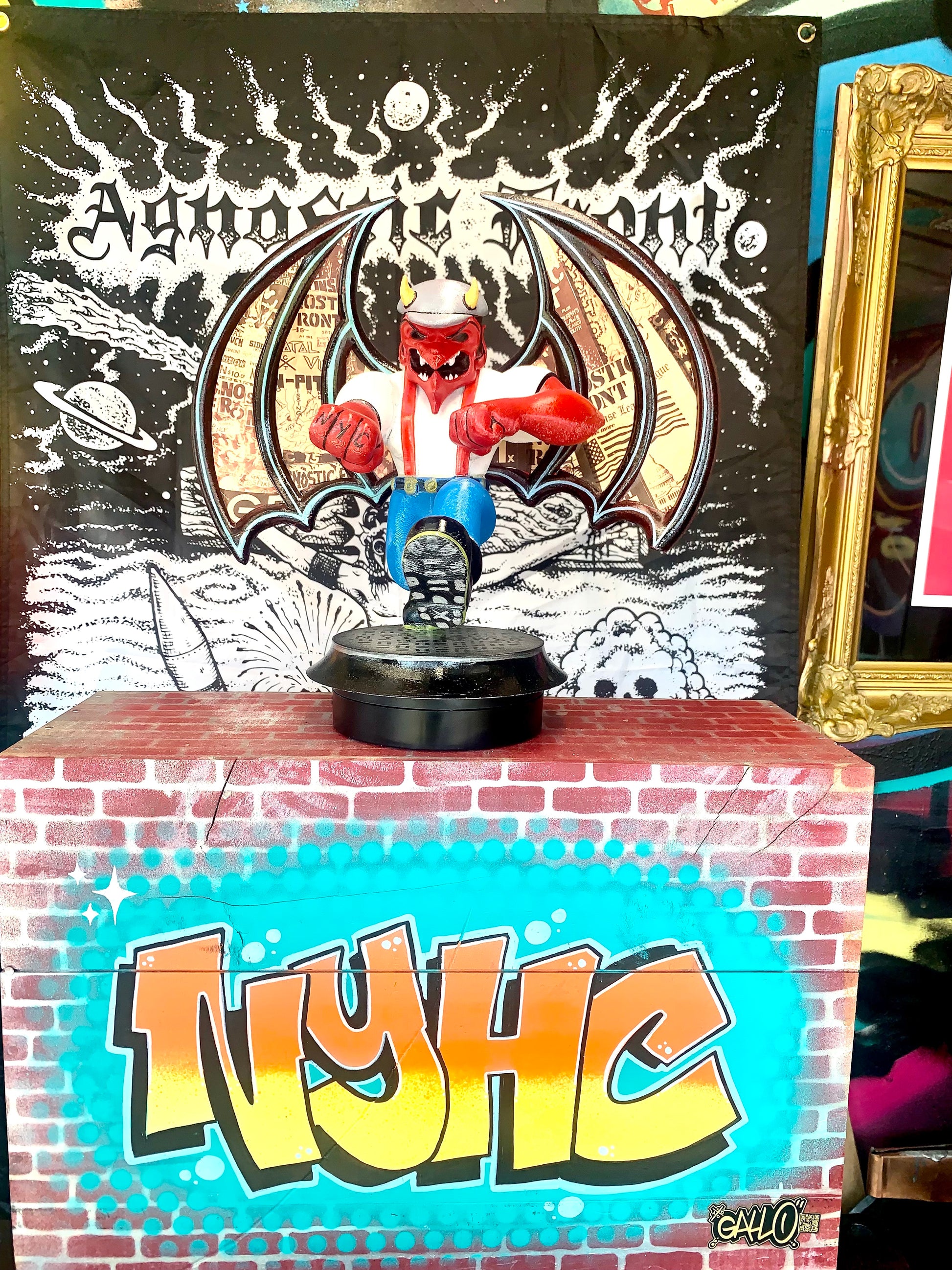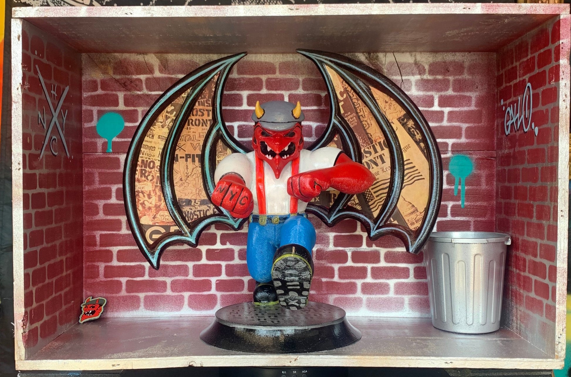 He’s 12 inches high and wide. 3D printed. Old school band flyers in his wings. Louie comes in a hand painted wine box, equipt with garbage can filled with stickers and a collectors enamel pin. This is not something that will be mass produced by a toy company. DIY style. GET IT NOW!